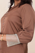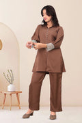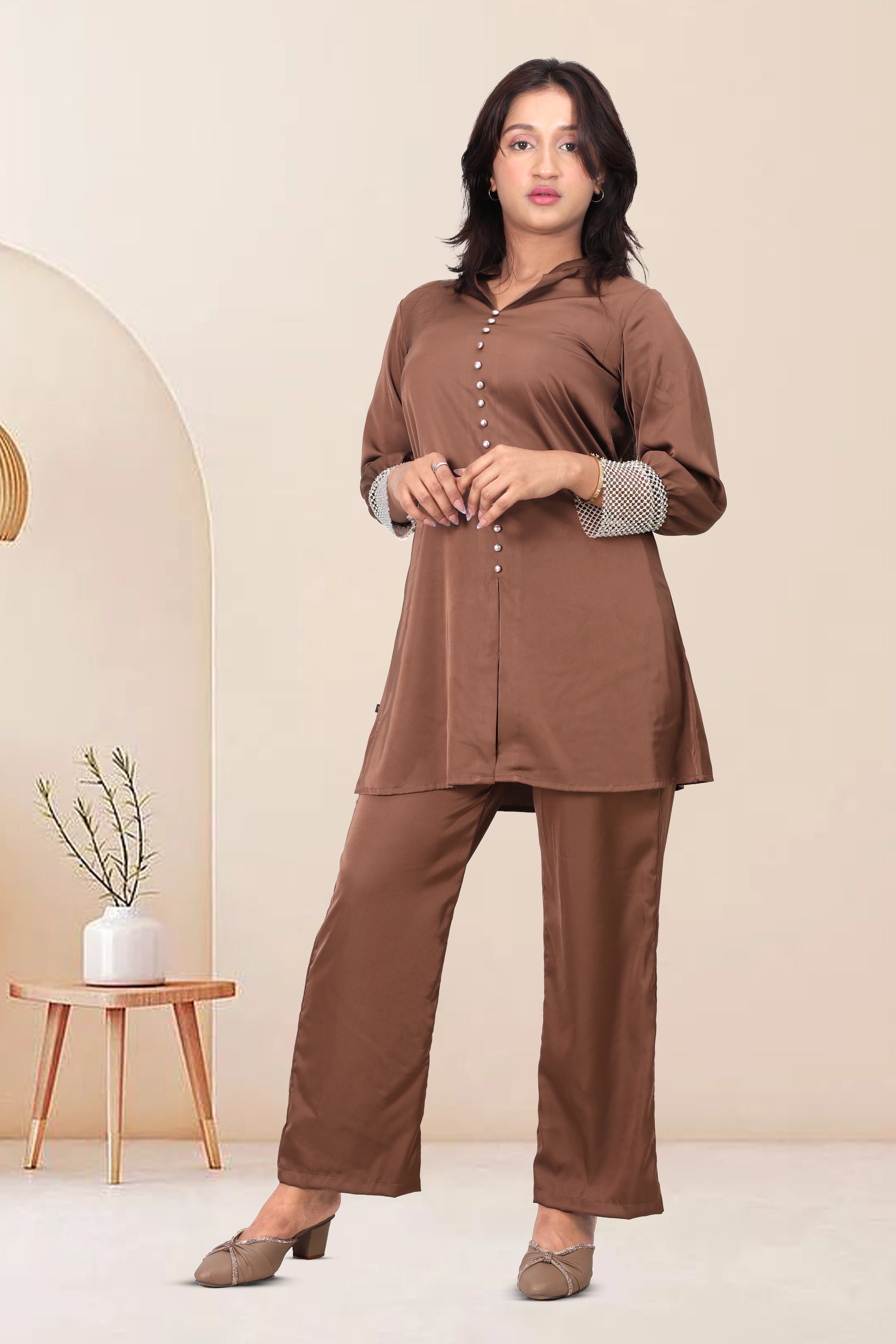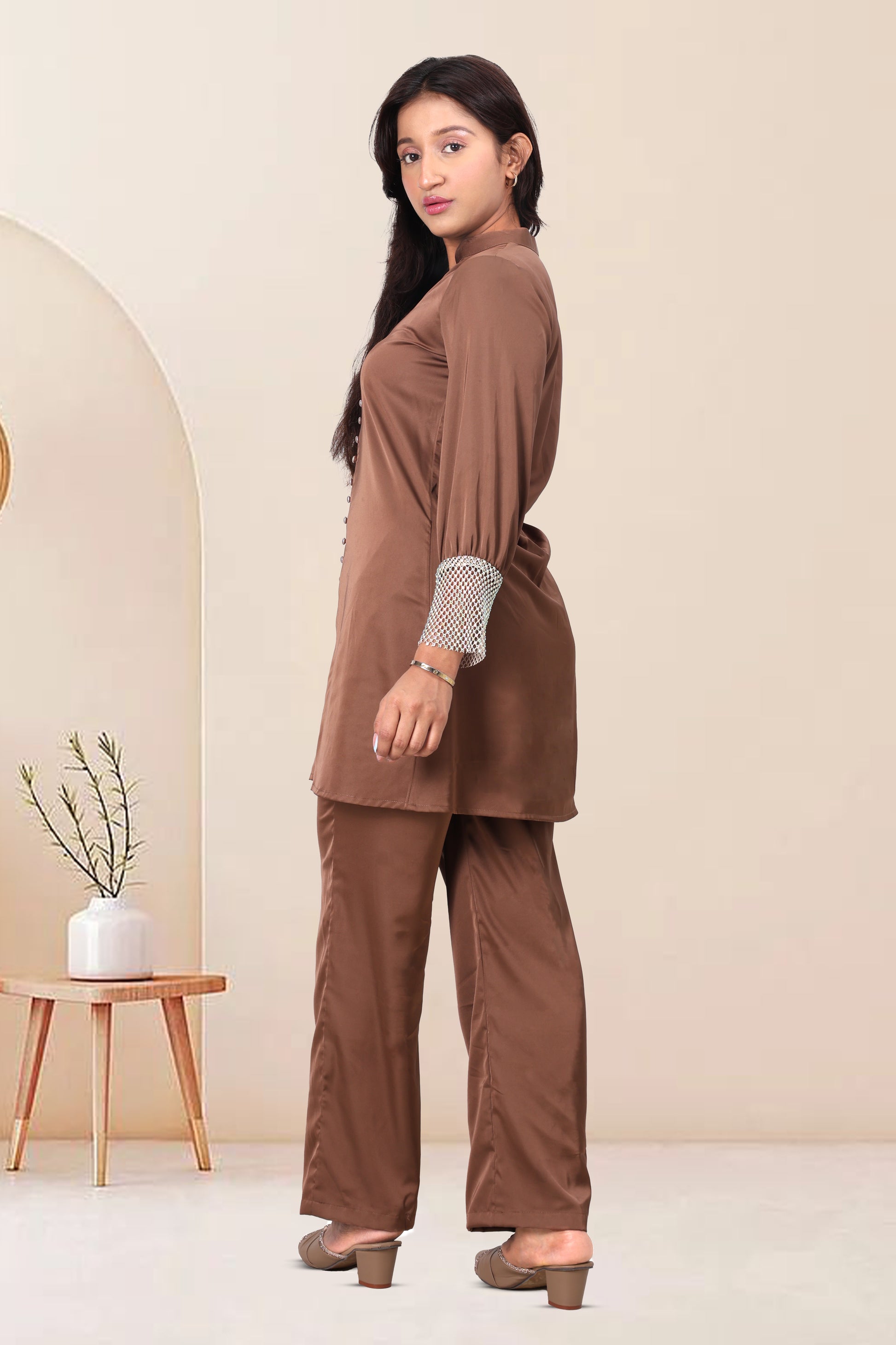 Step into effortless elegance with this sophisticated brown cord set — a perfect blend of comfort and style. The set features a long top with front button detailing and straight-fit pants, giving a sleek and classy look. The highlight of the outfit is its net cuff detailing, adding a modern touch to a timeless silhouette. Made from soft, breathable fabric, this outfit is ideal for casual outings, work wear, or festive gatherings.