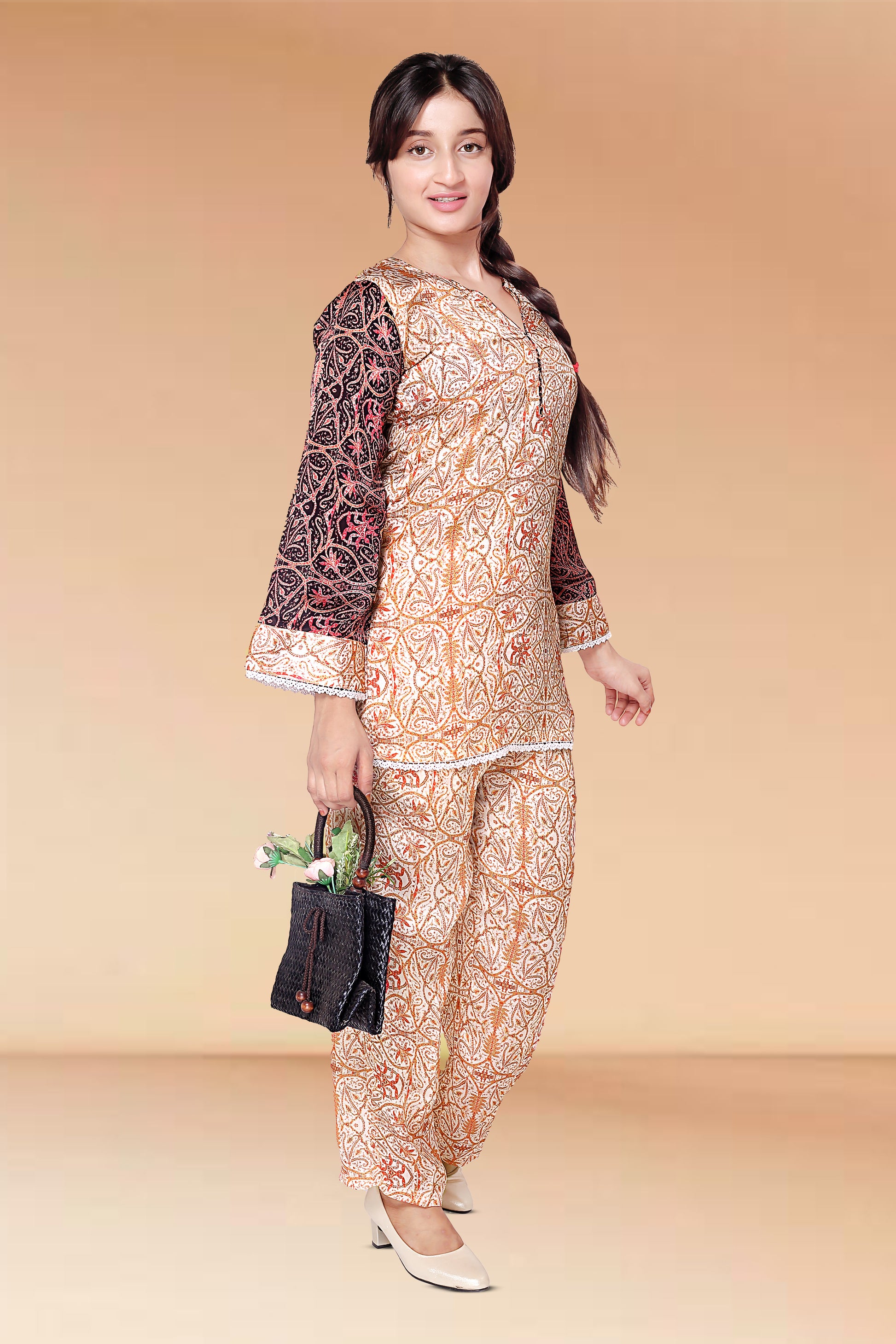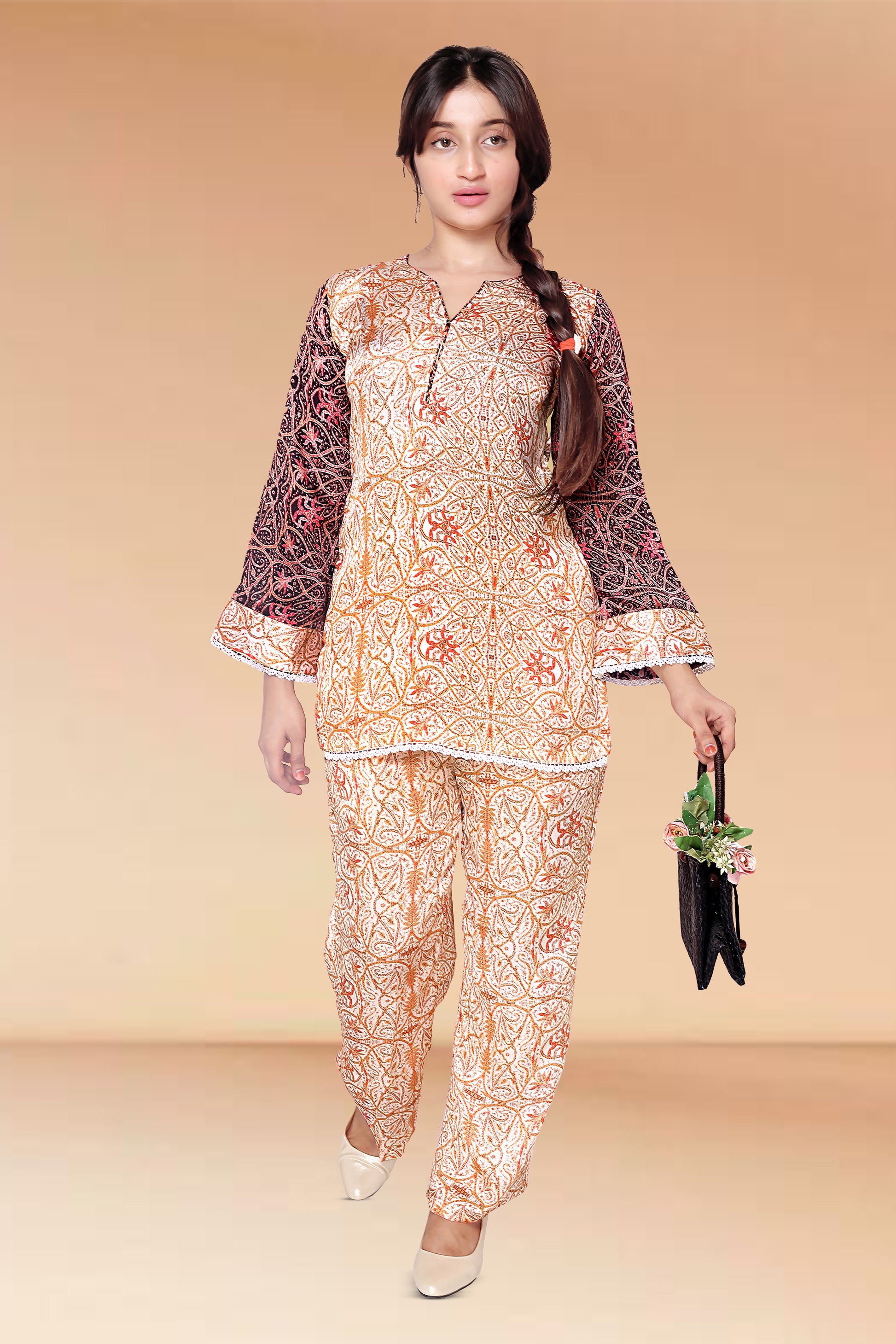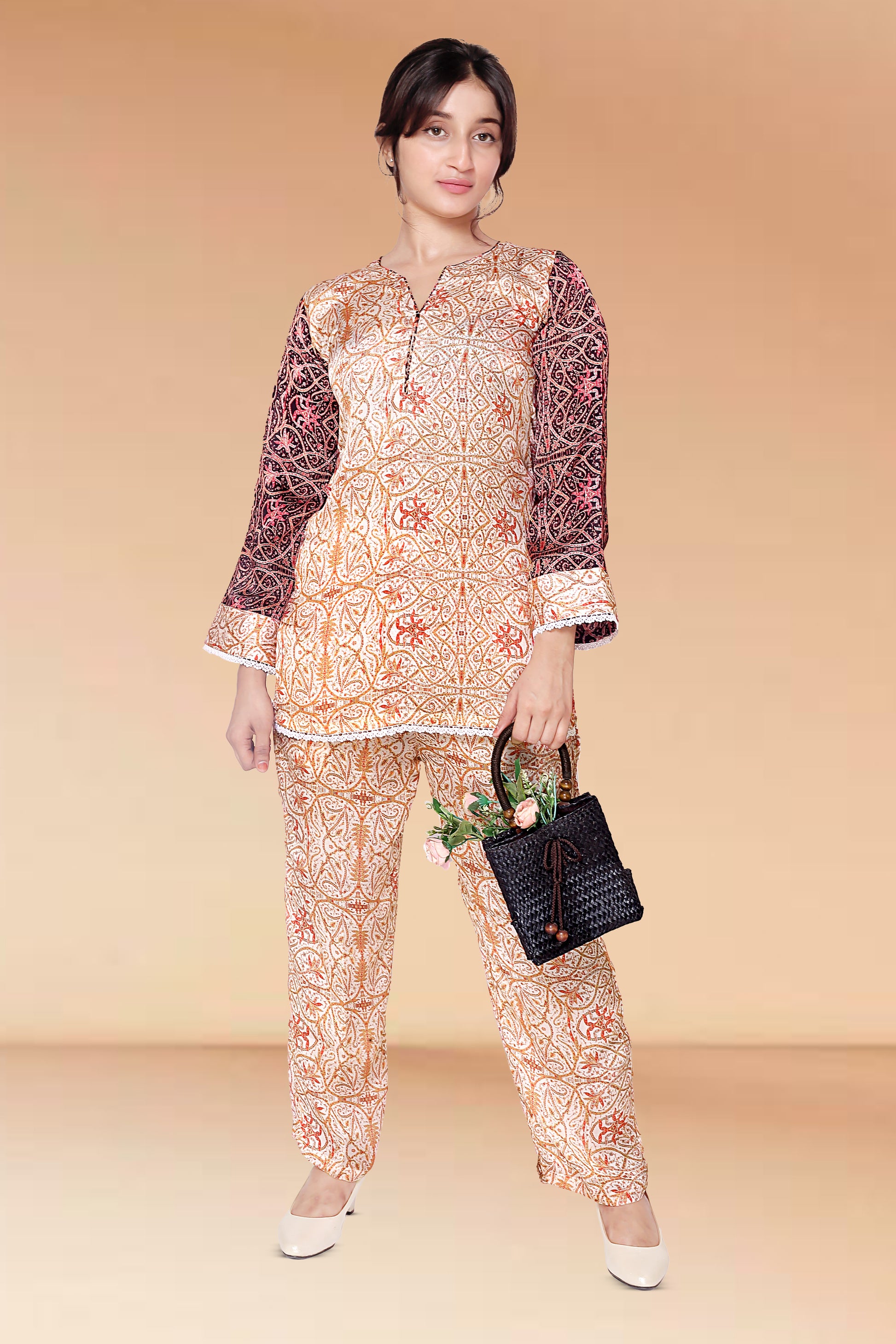 The matching bottoms continue the ethnic theme, creating a cohesive and stylish ensemble perfect for festive gatherings or casual elegance.